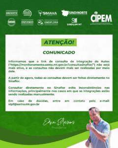 Informamos que o link de consulta de integração do Autex (“https://monitoramento.sema.mt.gov.br/consultasinaflor/”) não está mais ativo, e as consultas não devem mais ser realizadas por meio dele.